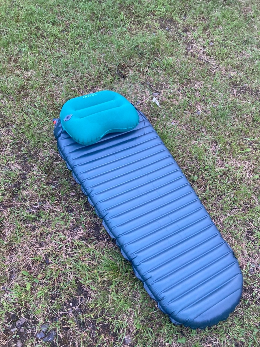 マットはサーマレストの「ネオエアーウーバーライト」。真夏だからか、120cmというマットの短さも気になることはなく、一緒に持っていた「山と道ミニマリストパッド」と合わせて快適に寝ることができました。ウーバーライトは6cmもの厚みがあるので、クッション性もよく、反発も気持ちいいです。R値=2.3で、夏〜秋用に適しています。